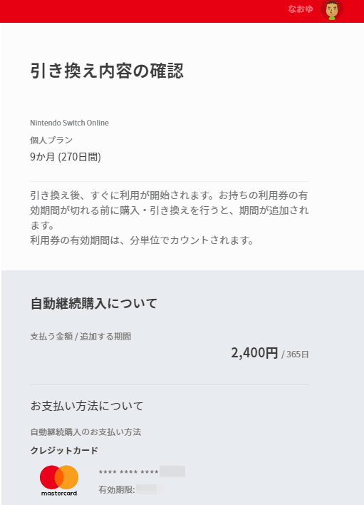 Nintendo Switch Onlineの利用券を取得する画面で、次の画像のような表示になります。