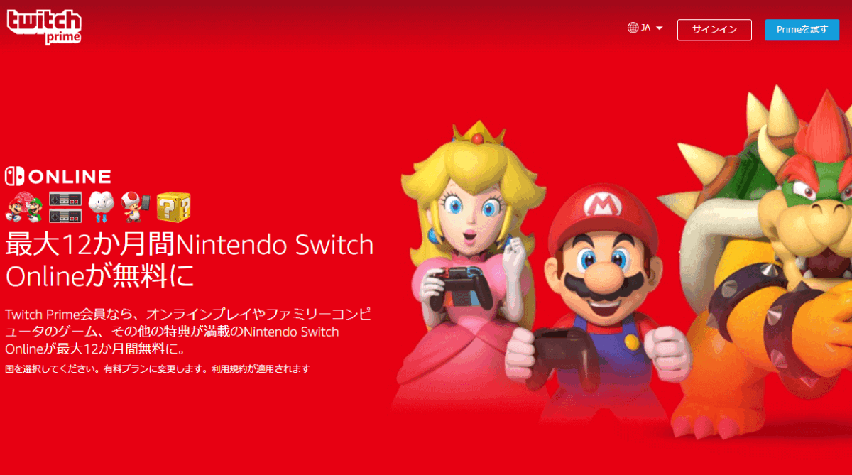 月額500円のTwitch Primeに登録すると、Nintendo Switch Onlineが最大12ヶ月も無料で利用できる特典がついてきます。