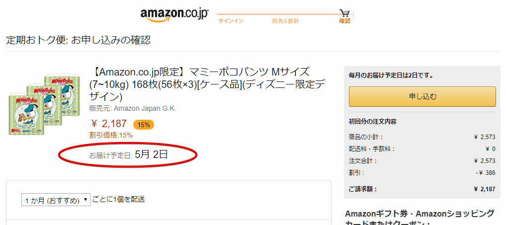 先ほどの申し込みでは、3月29日に申し込み、5月2日がお届け予定日になりました。