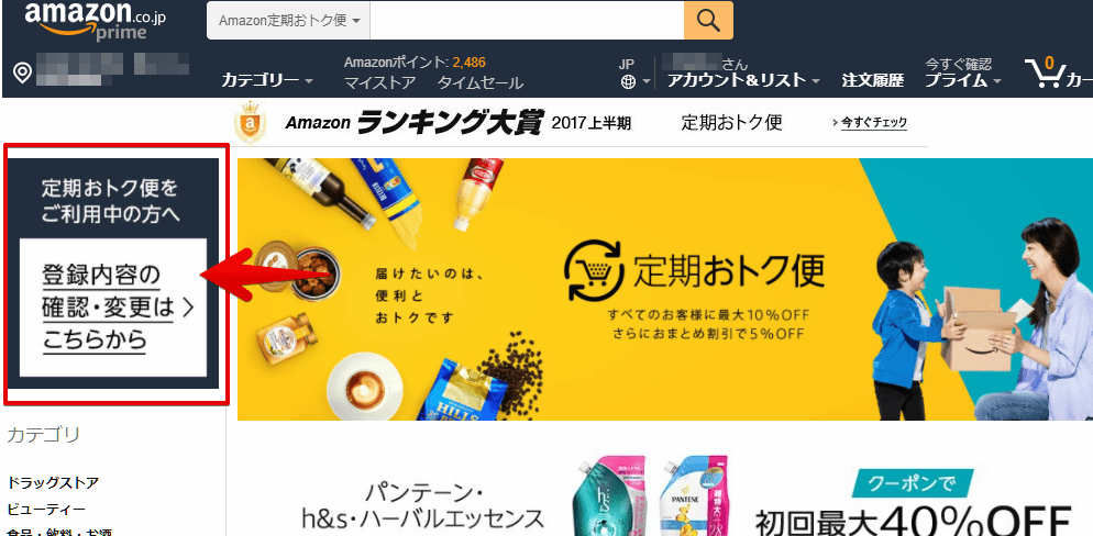 Amazon定期おトク便トップページで、「登録内容の確認・変更はこちらから」バナーをクリックします。