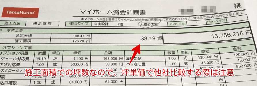 他社と金額を比較する場合、よく坪単価で比較することがありますが、注意しなければならないのは、タマホームの場合、施工面積で坪数を表記しています。