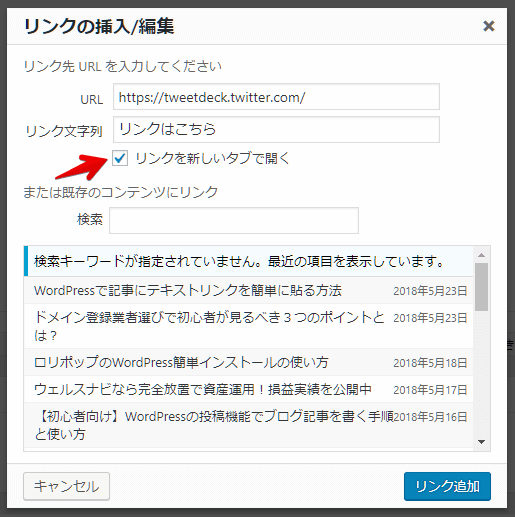 「リンクを新しいタブで開く」にチェックを入れると新しいタブでリンク先を開きます。