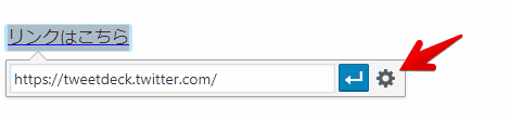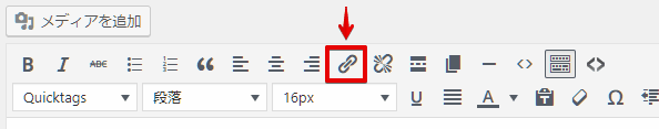 リンクをさせたいテキストを選択し、ツールの「リンクの挿入」アイコンをクリックします。