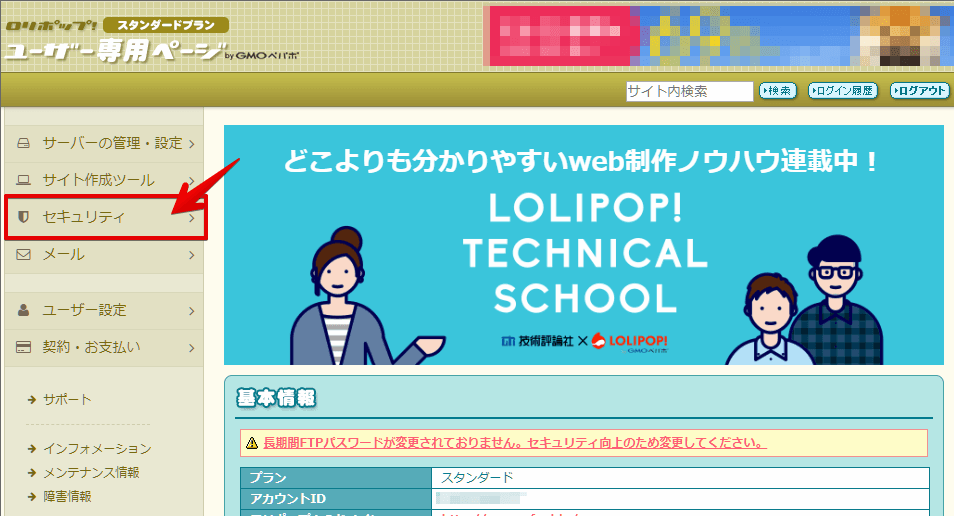 管理画面にログイン後、左メニュー「セキュリティ」をクリック。