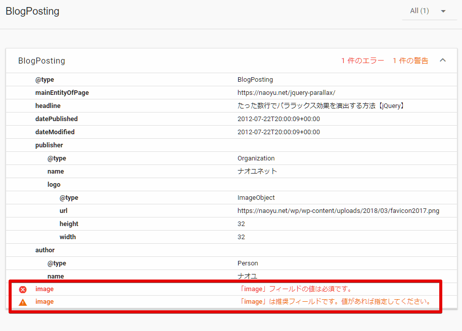 記事本文中の画像に配置しただけでは構造化データには含まれないので、アイキャッチ画像を確認してみてください。