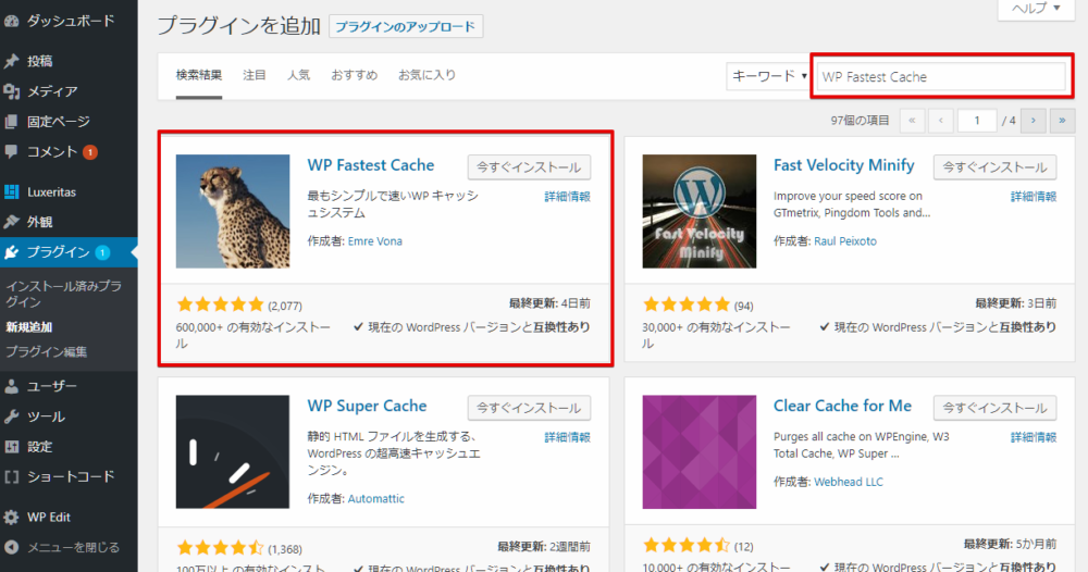 「WP Fastest Cache」と検索して表示されるヒョウのアイコンのプラグインの「今すぐインストール」をクリック。