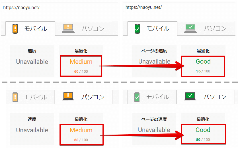 プラグインの有効化直後はスコアの変動は見られませんでしたので、後日あらためてPageSpeed Insightsで確認してみてください。